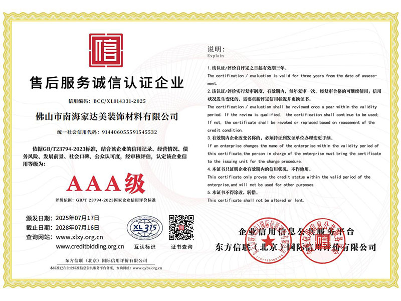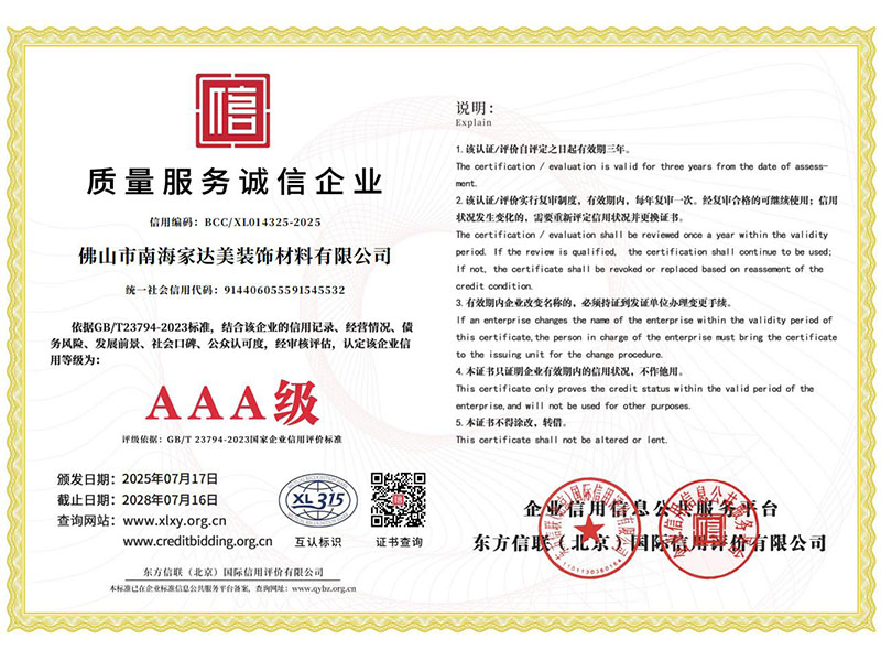 佛山南海家達美裝飾材料有限公司,成立于2001年,是一家集科研、設計、生產、銷售為一體的現代化PVC/PET裝飾膜、自粘膜,亞克力裝飾板的專業(yè)生產企業(yè),我們?yōu)槟愕娜菁揖颖砻嫜b飾提供一站式定制服務,已獲得ROHS,REACH,ISO9001質量管理體系等認證,目前已遠銷包括中東,中亞,東南亞國家等世界各地。